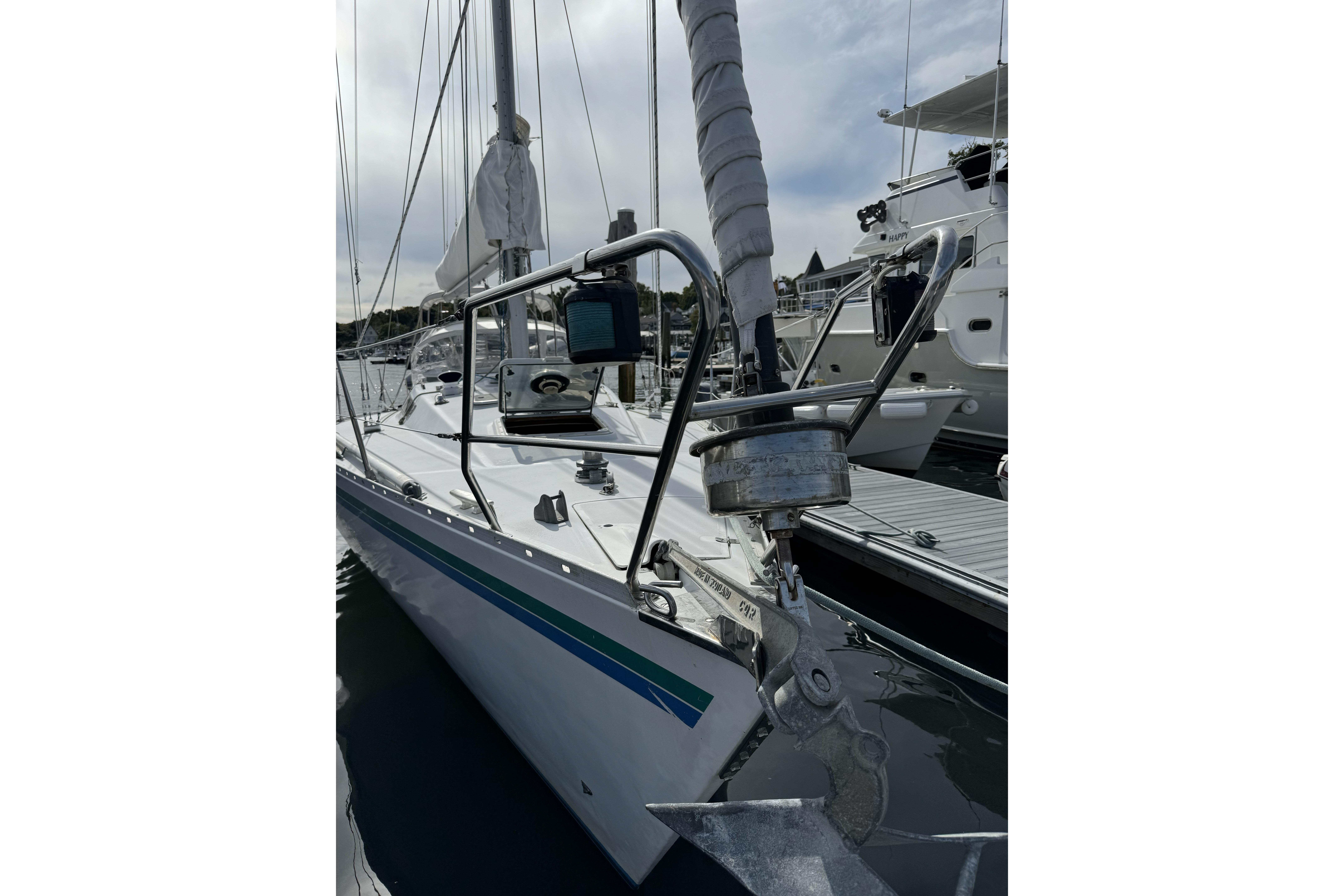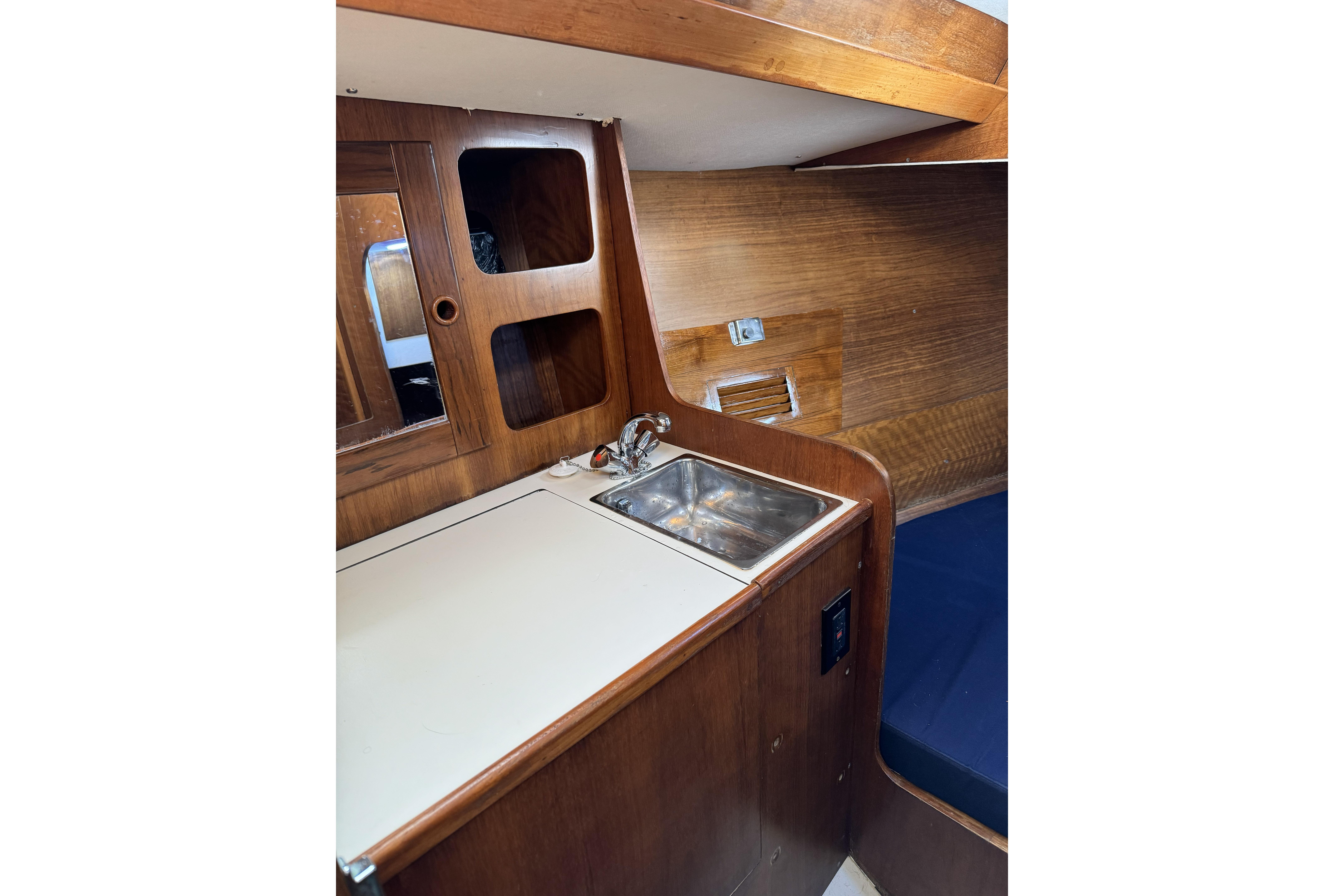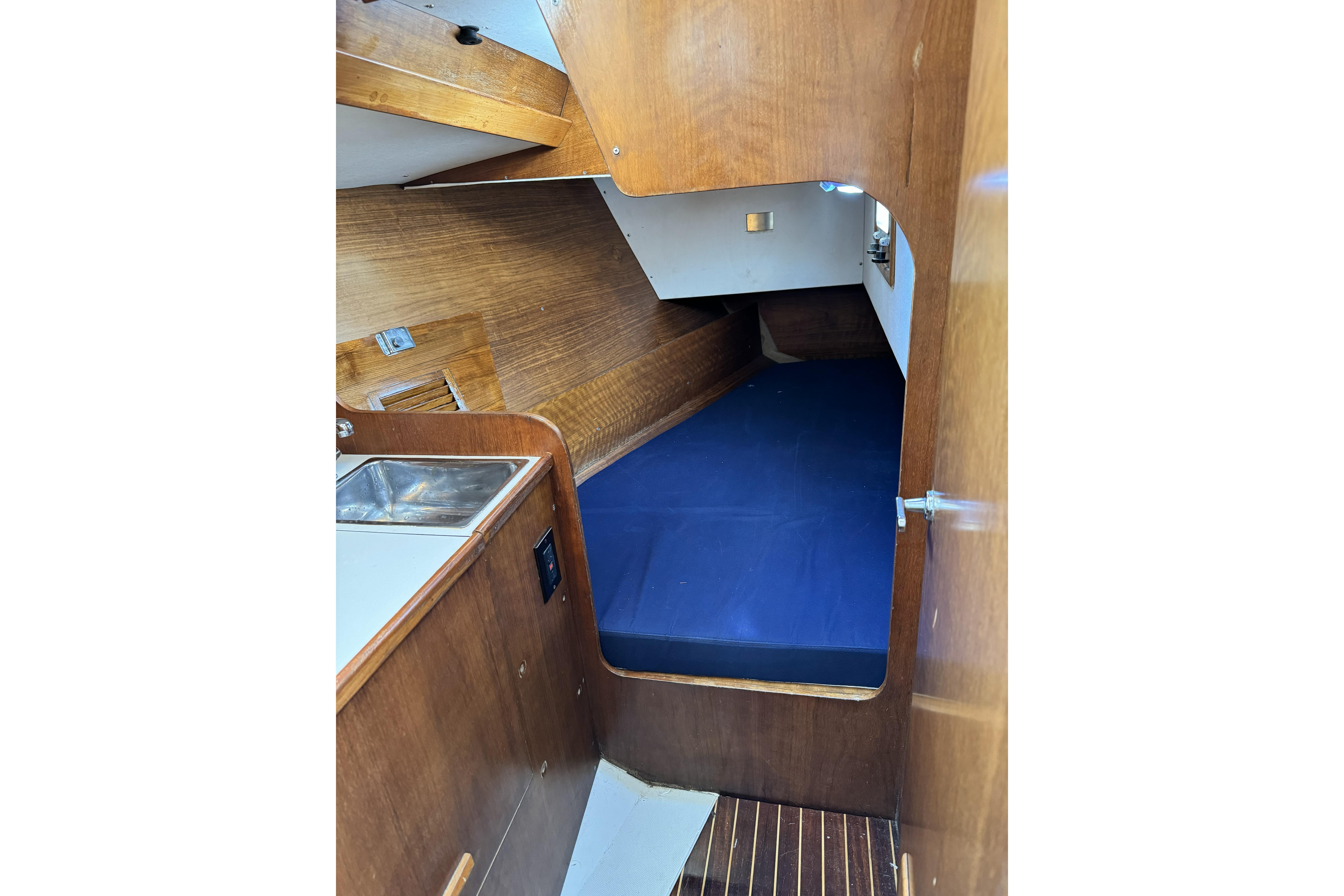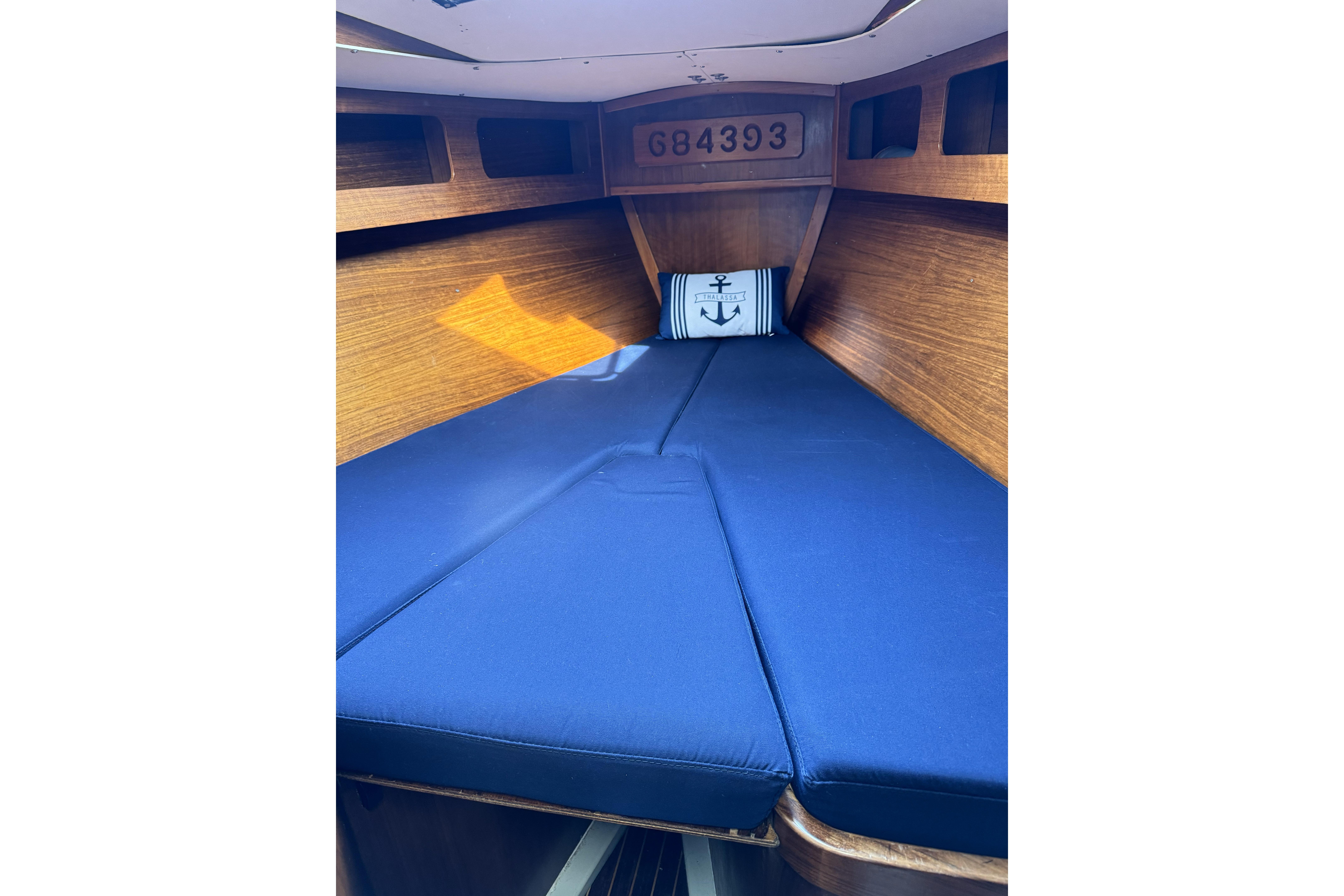 1984 Barberis 38 new to the market. Fabulous looking Italian manufactured yacht. Beautifully varnished warm rich mahogany interior with queen size v-berth featuring generous storage. Enclosed head and shower. Spacious salon with lush blue upholstery settees on port and starboard with aft L-shaped galley and navigation station. Queen size aft cabins on port and starboard sides with storage.