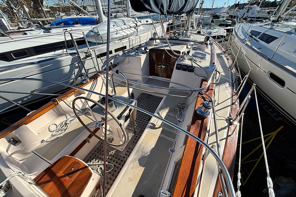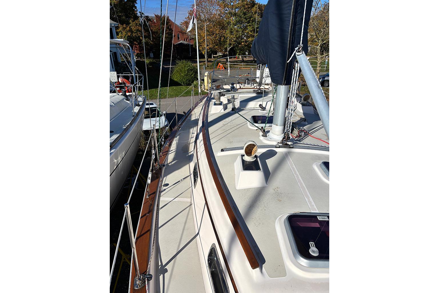The Island Packet 37 offers sparkling performance, superior safety and seakeeping, ease of handling and spacious and livable accommodations. Island Packet Yachts' exclusive Full Foil Keel unifies the performance attributes of modern hull and foil designs. This design brings numerous benefits to the cruising sailor: superior protection from damage or fouling of both prop and rudder, an integral hull and keel structure for the strongest possible unified construction, a moderate draft with exceptional stability allowing shallow water gunkholing or worldwide voyaging, and spirited performance capabilities. On deck, the well-engineered layout provides the safety and security needed in offshore conditions through full-length cabin top handrails, wide unobstructed side decks, and recessed foredeck with bulwarks. The integral bowsprit- anchor platform increases sail area, improves sheeting angles for enhanced performance, while providing ready stowage and immediate access for two anchors and their tackle. The 8-foot long cockpit has full-length contoured seats offering plenty of room for both comfortable sitting or stretching out. A premium, console-mounted rack and pinion steering system provides the sensitive feel and rugged reliability available only from a direct-geared steering system. A rudder shaft control arm and interior mounting shelf are provided to facilitate the installation of an autopilot. The raised bridgedeck, lock-in companionway boards, bilge pump mount adjacent to the helm and large cockpit scuppers further ensure safety at sea. The standard cutter rig has furling systems on both the genoa and self-tending staysail. The skipper has a variety of sail combinations available that are easily adaptable to maximize comfort, safety and performance over a wide range of wind and sea conditions. Belowdecks, convenient to both the cockpit and salon, yet out of companionway traffic, the galley is host to a number of design details that will make it the delight of the onboard chef. The main salon has a fold-away table, mounted on the main cabin bulkhead to provide an unobstructed salon area when the table is not needed. A pull-out panel in the L-shaped port settee converts this area into an extra double berth. The navigation station features a large hinged table with a generous stowage tray underneath. The private forward stateroom features a wide, 6-foot 6-inch V-berth with generous storage space. The enclosed aft stateroom features a double berth and convenient upholstered dressing seat. The engine is conveniently located in an easily accessed compartment, complete with premium, lead-lined sound insulation and integrally molded drip pan. Overhead interior hand rails, bulkhead hand grips and an easily maintained, slip-resistant cabin sole in the high-traffic areas helps provide sure-footed movement while underway. A harmonious blend of tasteful designer surfaces, premium fabrics, and meticulously hand-crafted, oiled teak joinerwork conveys a sense of style and comfort, while a host of thoughtful details, such as courtesy lights with a companionway switch, make the 37's interior exceptionally livable and practical. Advanced construction technology utilizing custom blended resins, 100 per cent hand-laminated, premium knitted biaxial and triaxial fiberglass reinforcements and Island Packet's exclusive PolyClad hull gelcoat system combine to provide vastly superior resistance to impact, puncture resistance and osmotic blistering. Deck laminates are engineered for high strength with reduced weight utilizing PolyCore. An engineered interior grid system and reinforced fiberglass structure joins with the hull to form a unit structure of immense strength and durability.